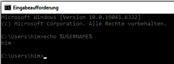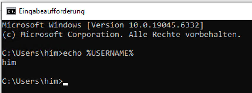 How to retrieve your local username? Press: Windows+r, type "cmd" and press OK. At the command prompt enter "echo %USERNAME%", see the picture on the right.