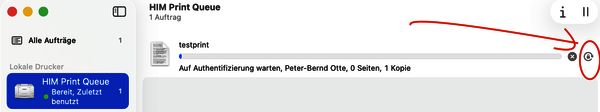 Your print job will be held for authentication. Click on the small circular icon to the right the print order: